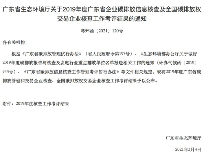 2021年3月4日,廣東省生態(tài)環(huán)境廳發(fā)布了《廣東省生態(tài)環(huán)境廳關(guān)于2019年度廣東省企業(yè)碳排放信息核查及全國碳排放權(quán)交易企業(yè)核查工作考評(píng)結(jié)果的通知》(粵環(huán)函〔2021〕120號(hào)),公布了廣東省生態(tài)環(huán)境廳2019年度廣東省企...