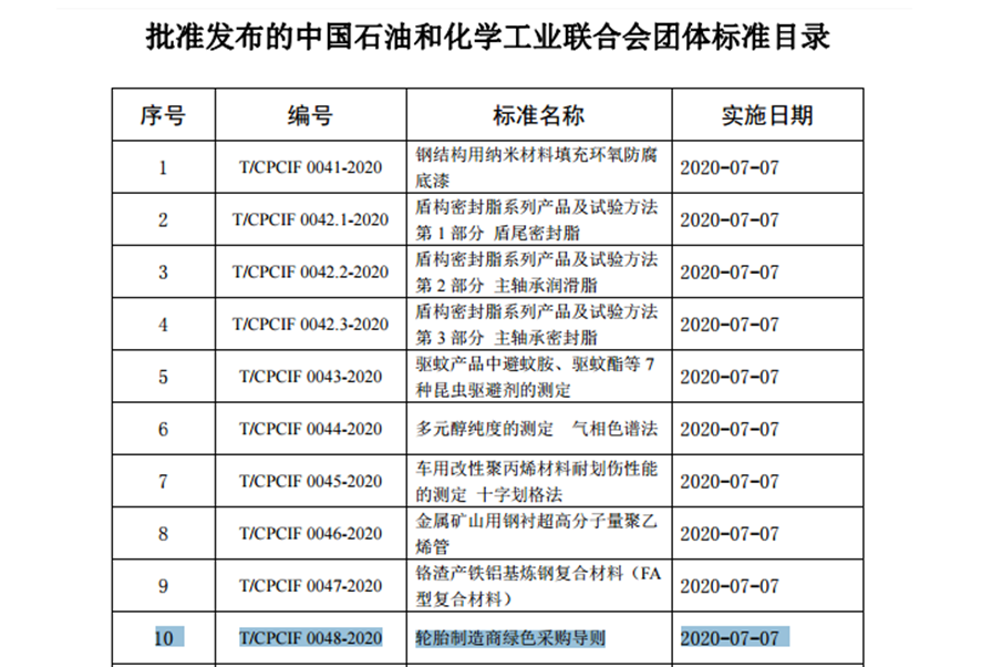 2020年4月7日,中國石油和化學工業聯合會發布了關于批準發布《鋼結構用納米材料填充環氧防腐底漆》等15項團體標準的公告(2020年01號)。由我司參與編制的團體標準《輪胎制造商綠色采購導則》(T/CPCIF 0048-2020)...